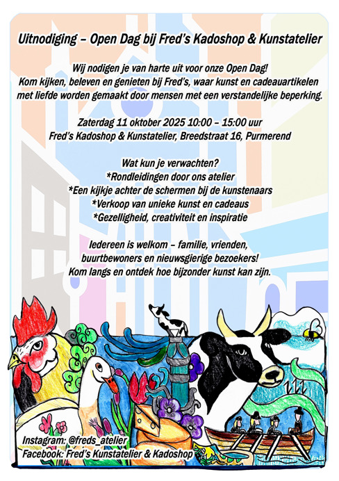 Op zaterdag 11 oktober is er een Open Dag bij Fred's, Breedstraat 16 in Purmerend. Tussen 10.00 - 15.00 uur kunnen mensen langskomen om een kijkje te nemen in het kunstatelier.